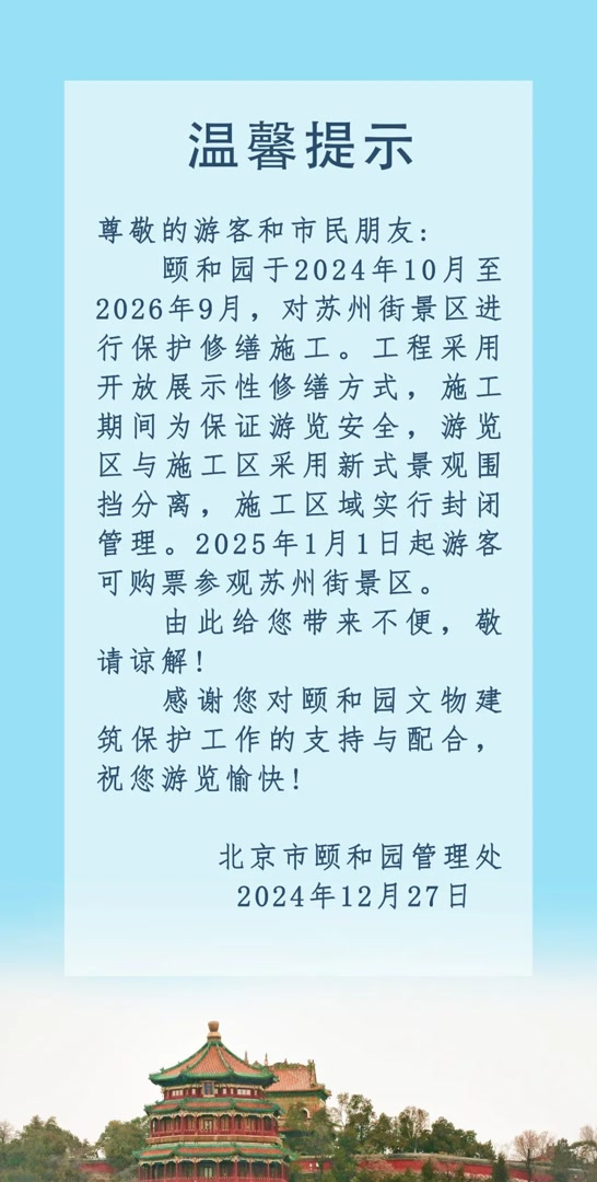 27日颐和园发布《温馨提示》:苏州街景区保护修缮工程采用开放展示性修缮方式。2025年1月1日起可购票参观杠杆证券资料。